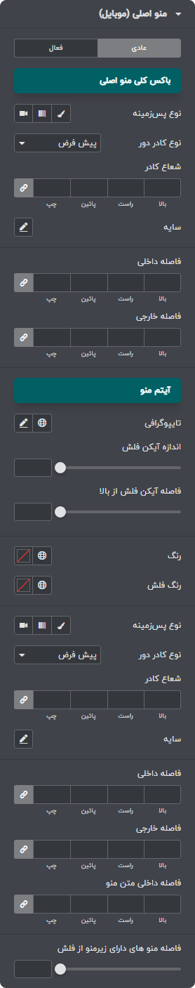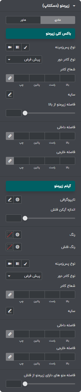 برای نمونه ما تصاویری از گزینه های سفارشی سازی المان منو را که از آن در هدر وبسایت استفاده نموده ایم را برای شما آماده کرده ایم.